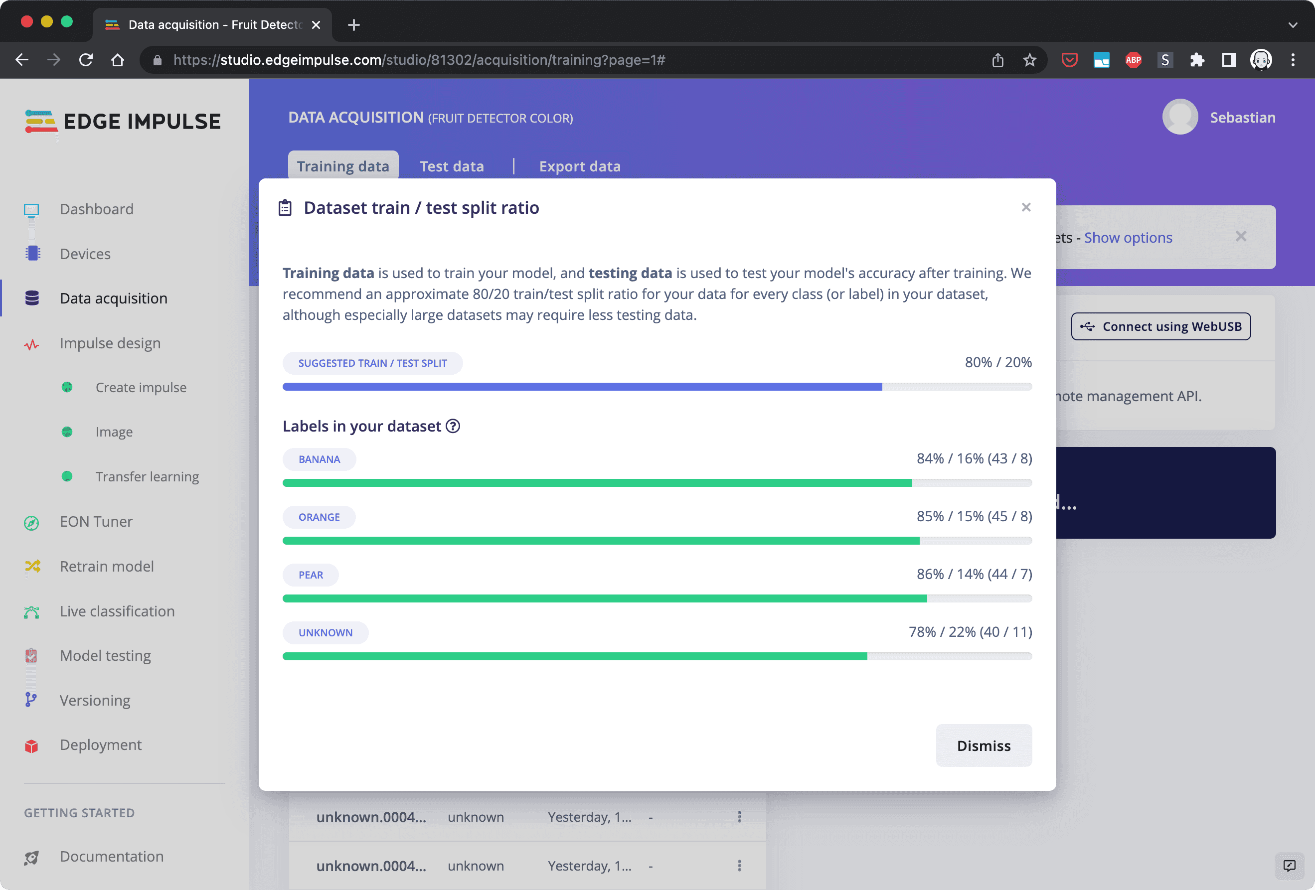 Edge Impulse® is a platform that simplifies the process of creating machine learning models by choosing reasonable defaults for the countless parameters you could set when creating a ML model. It provides a simple user interface that not only allows to train a ML model but also to inspect the data and test the model.