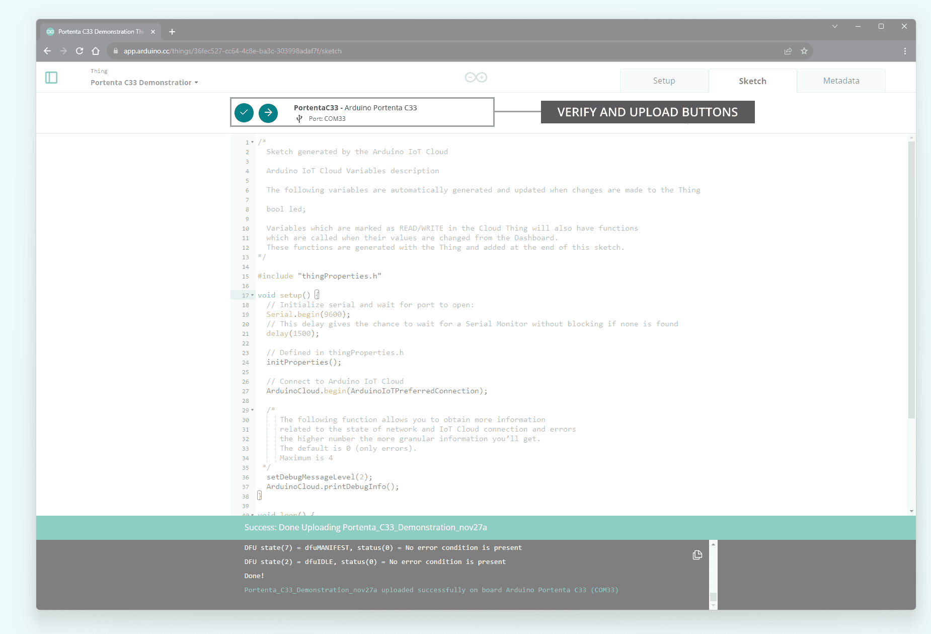 To upload the code to the Portenta C33 from the online editor, click the green Verify button to compile the sketch and check for errors, then click the green Upload button to program the board with the sketch.
