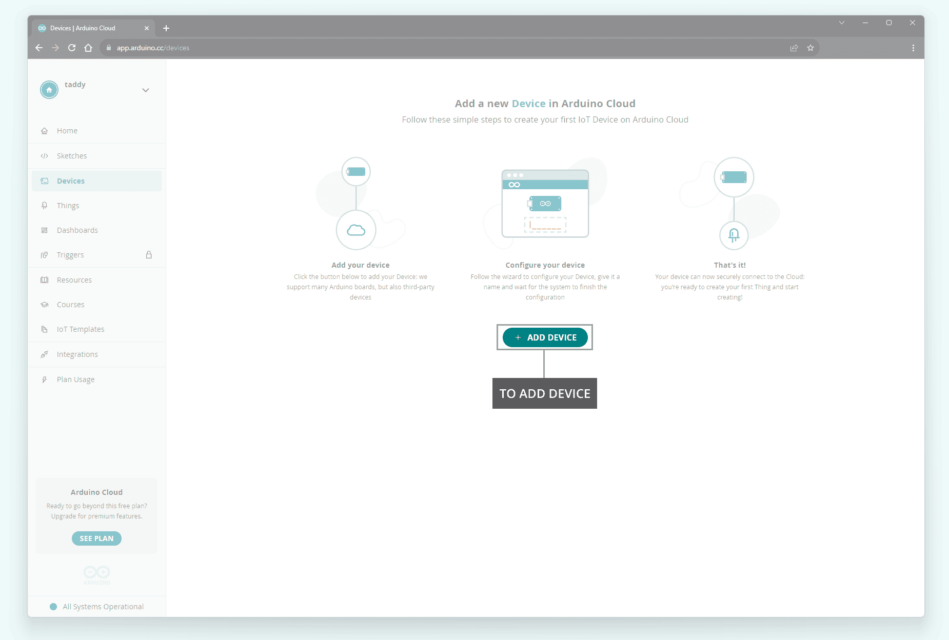 First, provision your Portenta C33 board on your Arduino Cloud space. To do this, navigate to Devices and then click on the ADD DEVICE button: