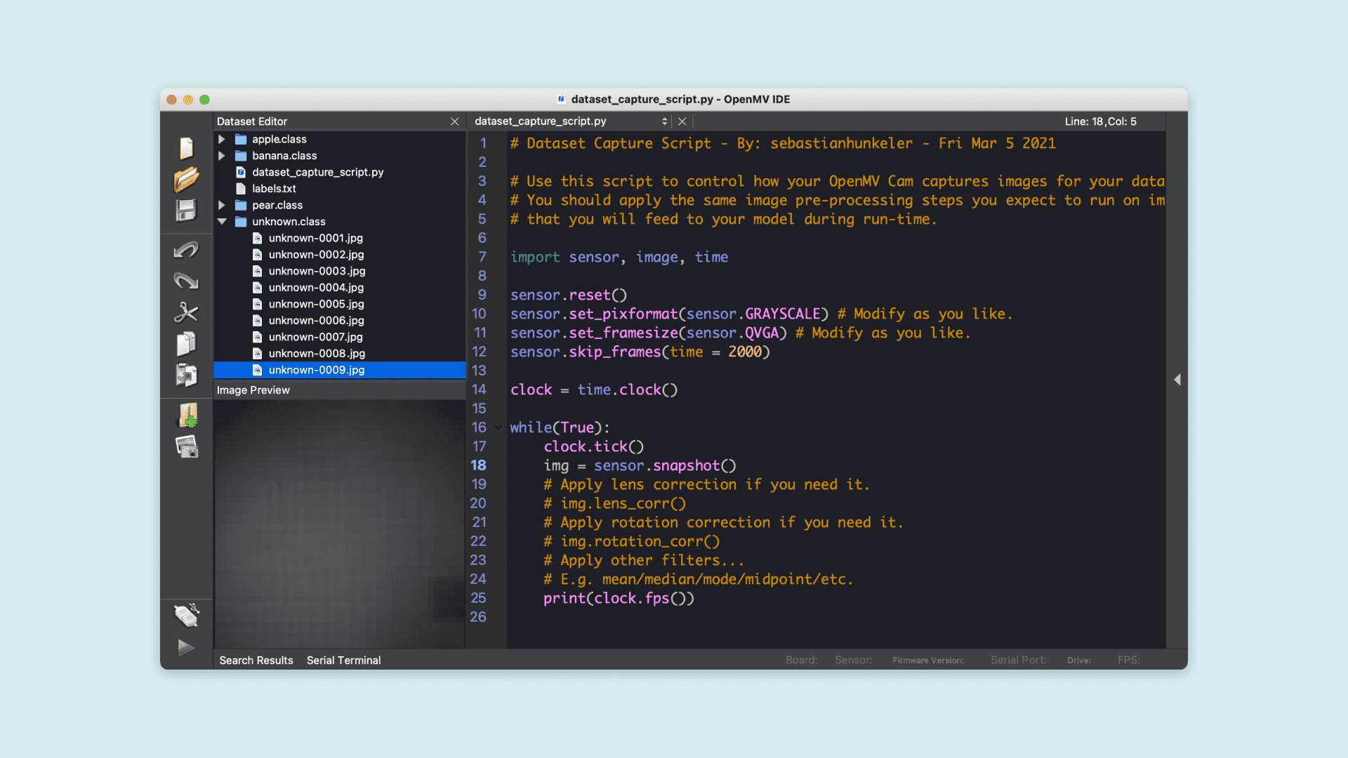The final step concerns running the ei_image_classification.py script. Open it in the OpenMV and replace the print statement in the innermost for loop with the following code: